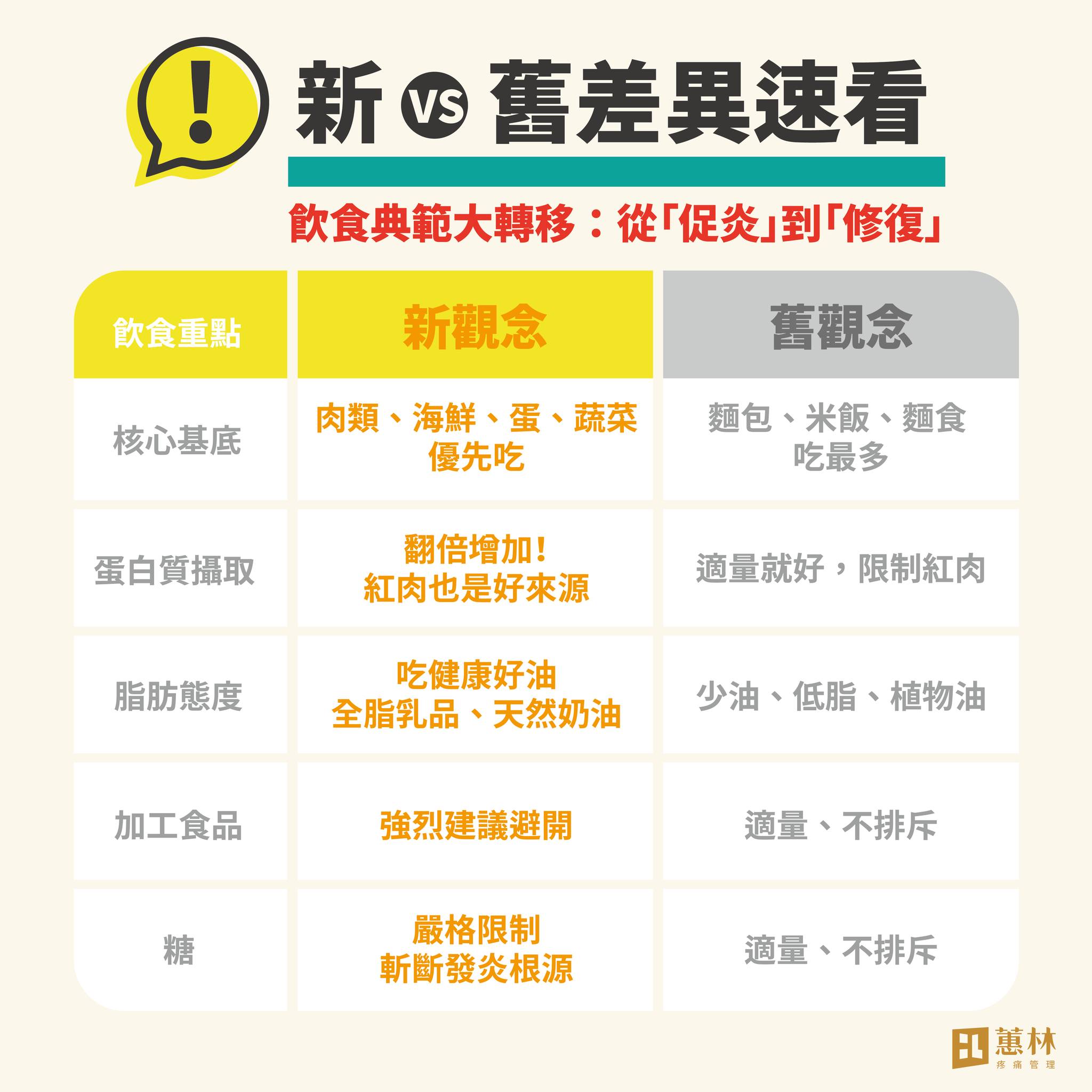 舊版強調熱量來源,穀類吃夠就好,身體能動就算及格;新版則更在意你吃進去的,能不能真的被拿去修補肌肉、筋膜與關節結構。從疼痛科來看,這正是「為什麼很多人沒受傷,卻一直痛」的根本差別,這時候其實要強化代謝的能力,需要健康的油脂來幫忙。