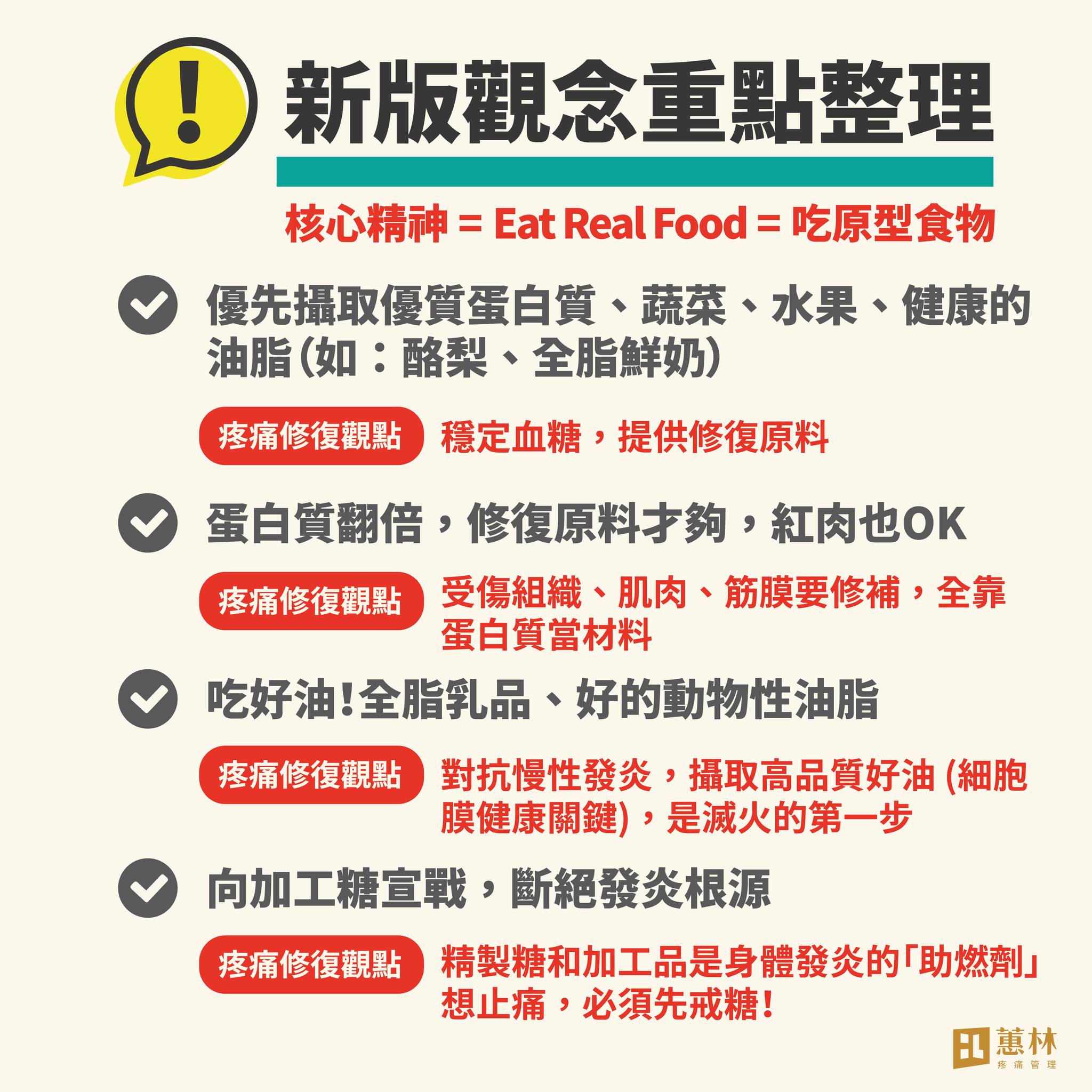 新版飲食觀念(2025~)之所以值得被重新看待,是因為它把重點從「填飽身體」拉回到「修復身體」,當蛋白質攝取充足、脂肪來源單純、精製澱粉與高度加工食品比例下降時,身體的修復環境會明顯改善,軟組織回彈能力變好,對治療、復健與運動的反應也更穩定。很多慢性疼痛並不是突然受傷,而是長期處在低度發炎與修復效率不足的狀態,新版飲食觀念對疼痛科而言,並不是流行趨勢,而是一個很實際的提醒:你每天吃進去的,不只是熱量,而是決定身體能不能修好自己的關鍵材料。